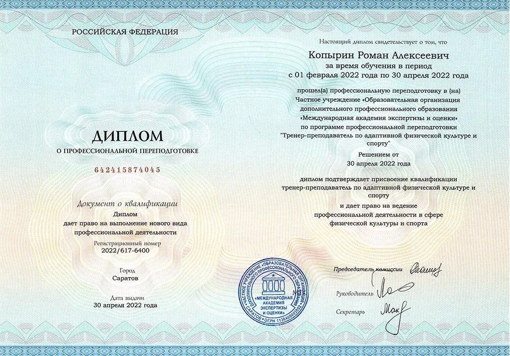 Квалификация по диплому: тренер-преподаватель по адаптивной физической культуре и спорту.