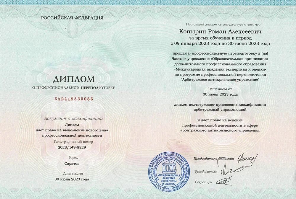 Квалификация по диплому: Арбитражный управляющий.